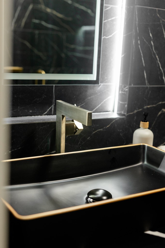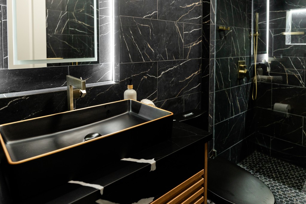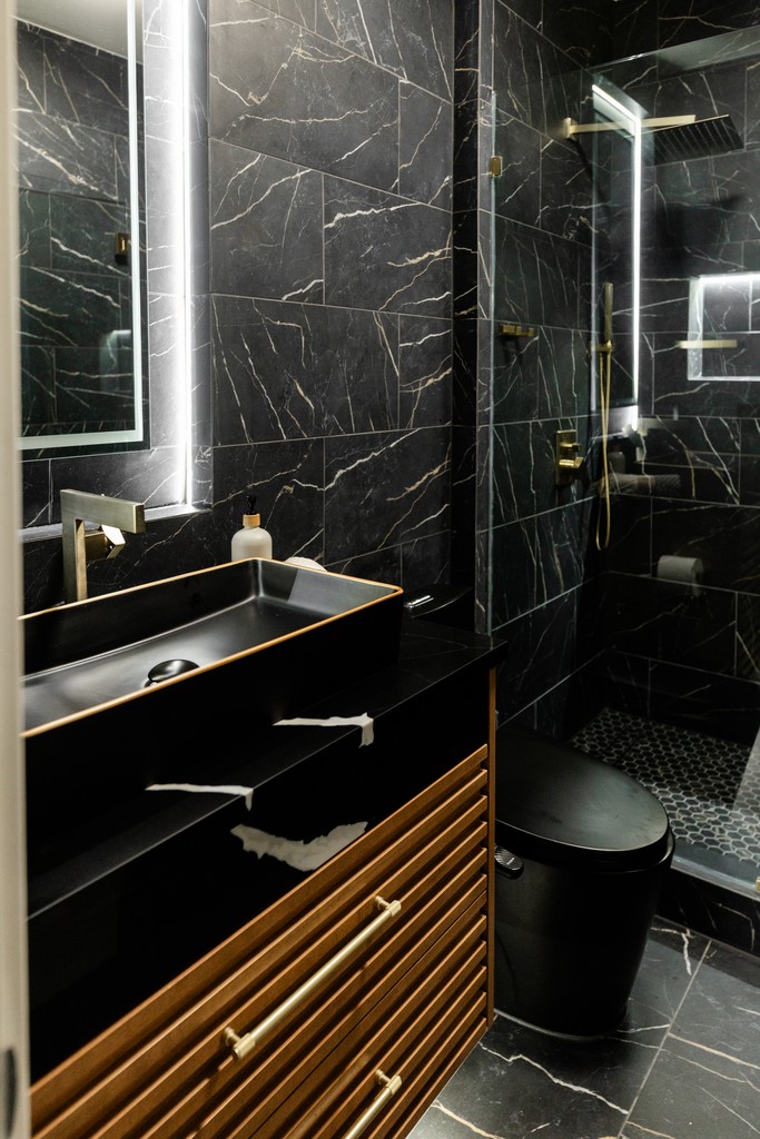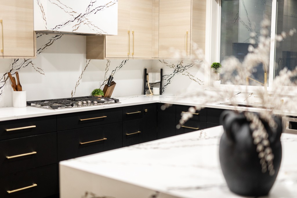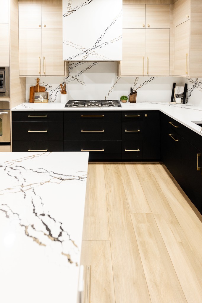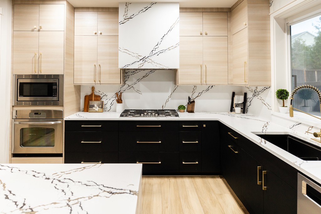 The Modern Luxe Residence began with a vision of sophisticated contemporary design that seamlessly integrates style and functionality. The kitchen serves as a striking focal point, featuring a modern aesthetic with a harmonious blend of rich wood textures and bold black finishes, topped off by a stunning quartz countertop embellished with gold accents. Custom cabinetry enhances this space, with each kitchen cabinet and vanity crafted to the client’s unique preferences, ensuring a personalized touch that complements the overall design.