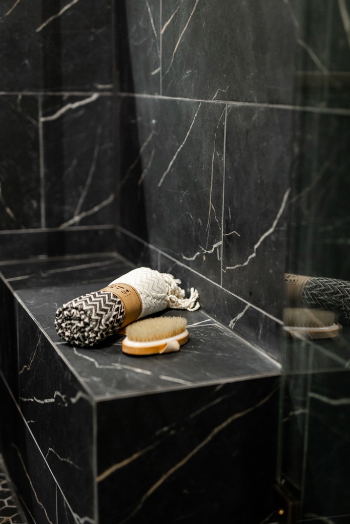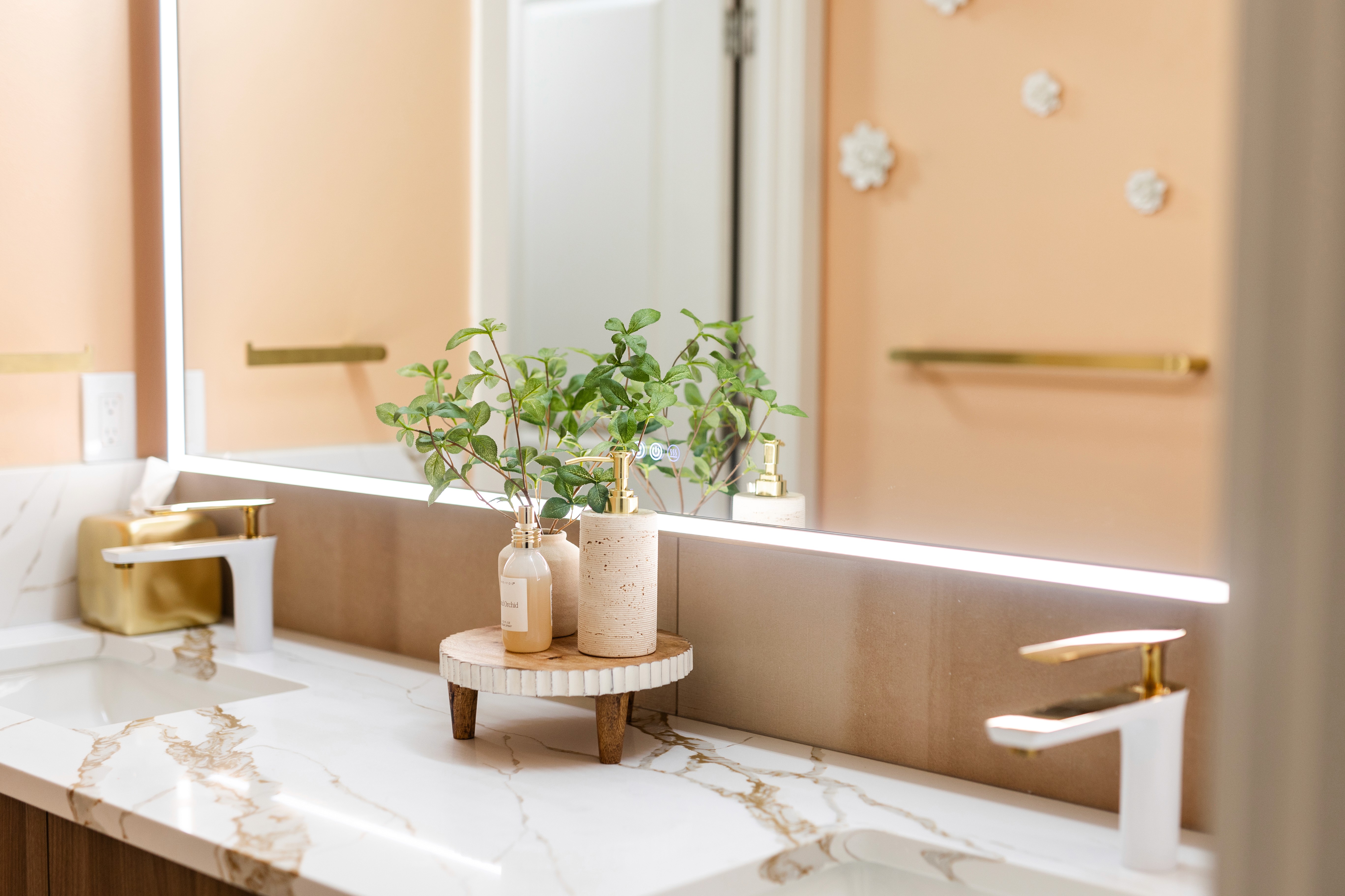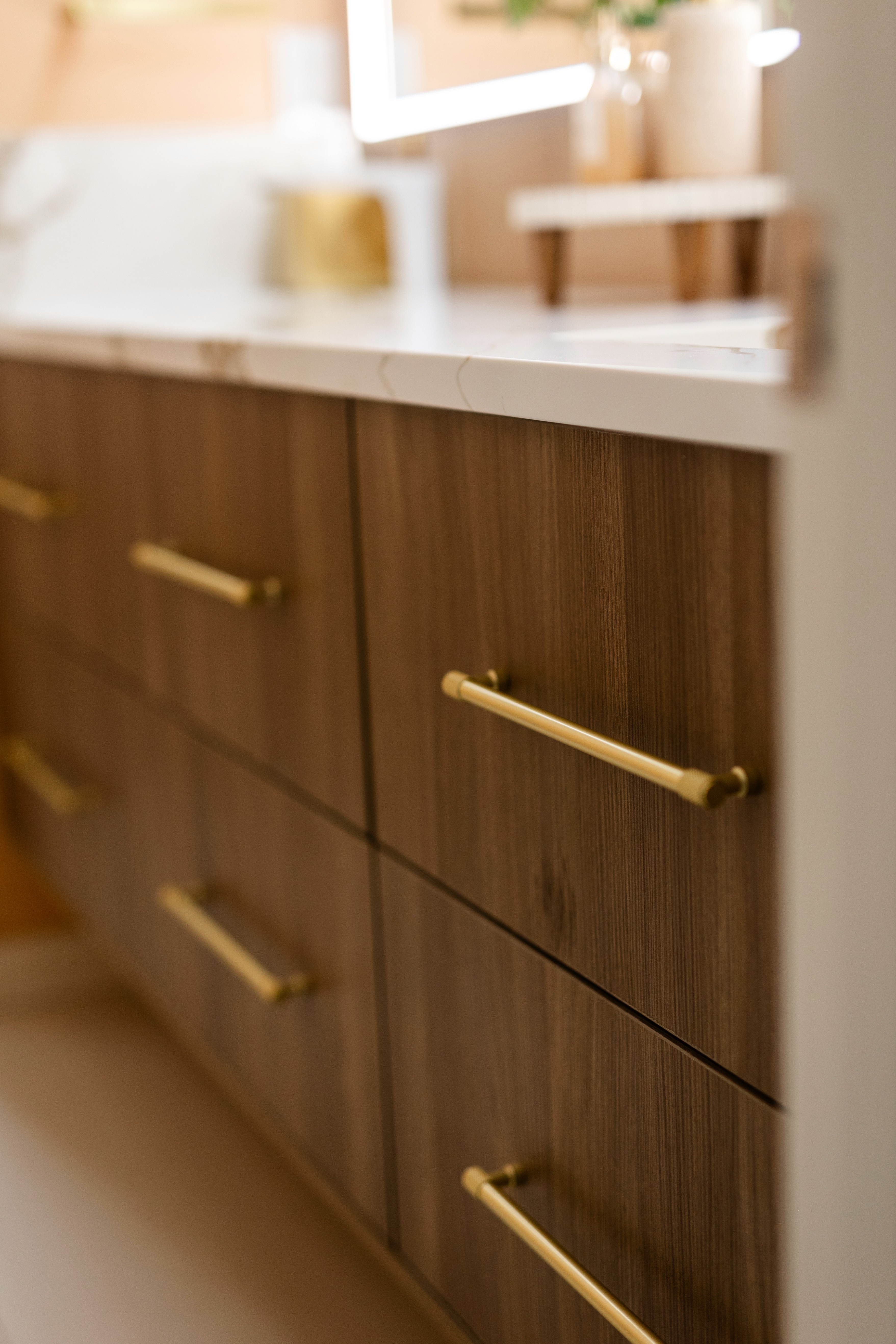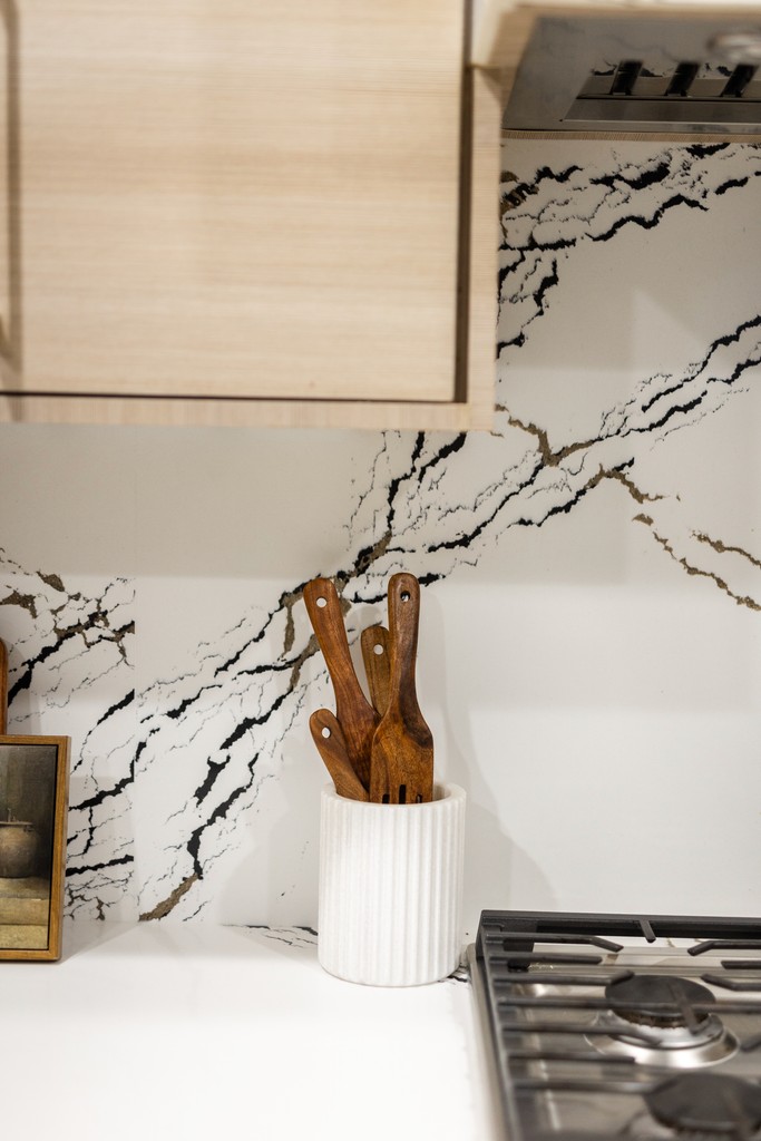 The Modern Luxe Residence began with a vision of sophisticated contemporary design that seamlessly integrates style and functionality. The kitchen serves as a striking focal point, featuring a modern aesthetic with a harmonious blend of rich wood textures and bold black finishes, topped off by a stunning quartz countertop embellished with gold accents. Custom cabinetry enhances this space, with each kitchen cabinet and vanity crafted to the client’s unique preferences, ensuring a personalized touch that complements the overall design.