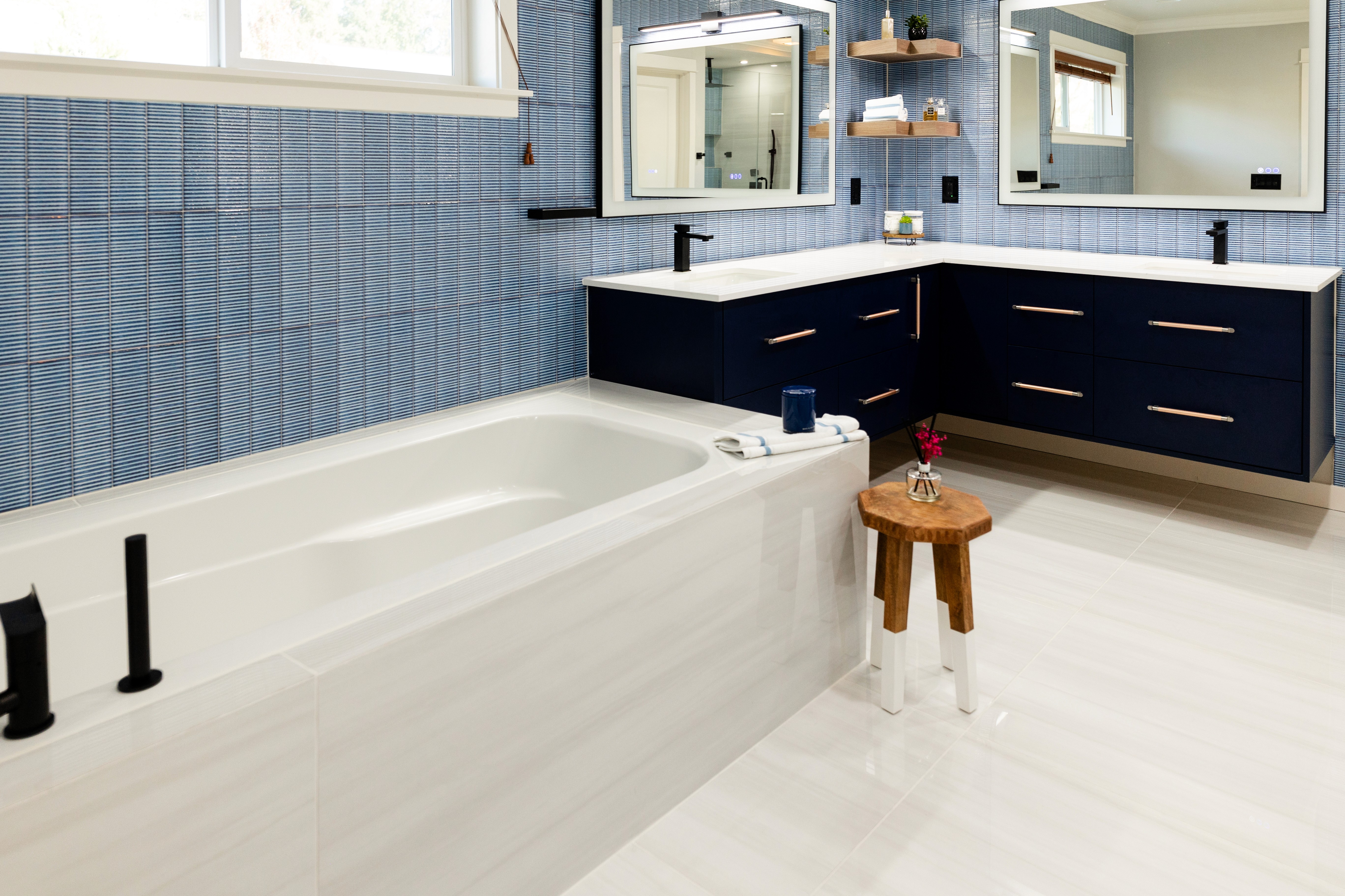 The master bath is thoughtfully tailored to the client’s taste, featuring a calming blue tint that transforms the space into a serene retreat. Custom vanities in this bathroom reflect the desired aesthetic, combining elegance and functionality. Meanwhile, the chic kids' bath exudes elegance and sophistication, ensuring a stylish yet functional environment, complete with custom vanities that meet the family's needs. The powder room makes a statement with its striking black beauty, further enhancing the home's overall design narrative.